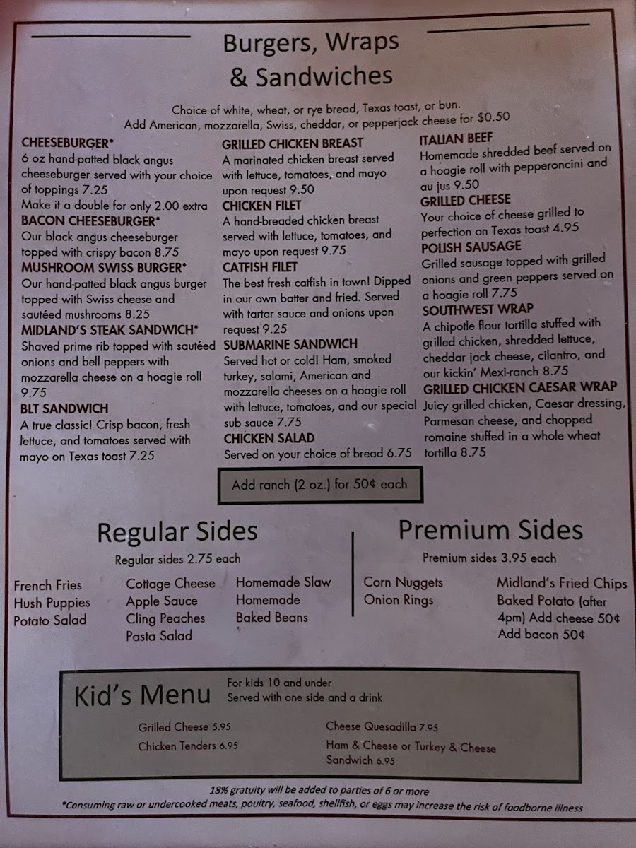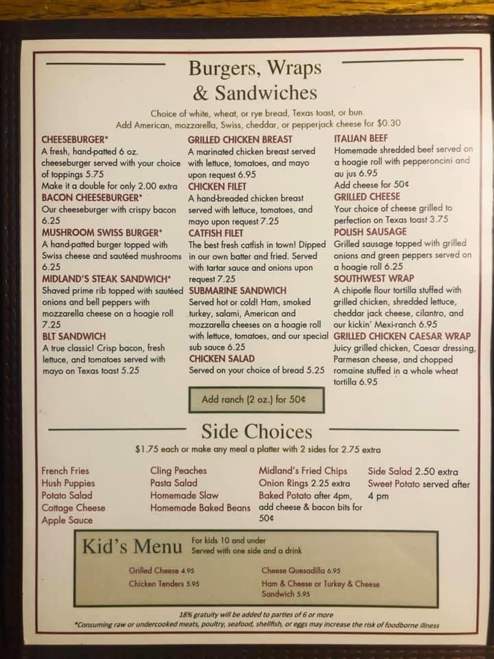 Dessert enthusiasts will be delighted by options such as the rich turtle cheesecake and creamy coconut cream pie. Patrons have praised the rib dinner for its robust flavors, while the fried chicken sandwich and brisket have caught the hearts (and appetites!) of many. Despite occasional crowds, Midland Inn's great food and warm atmosphere make every visit a satisfying experience.