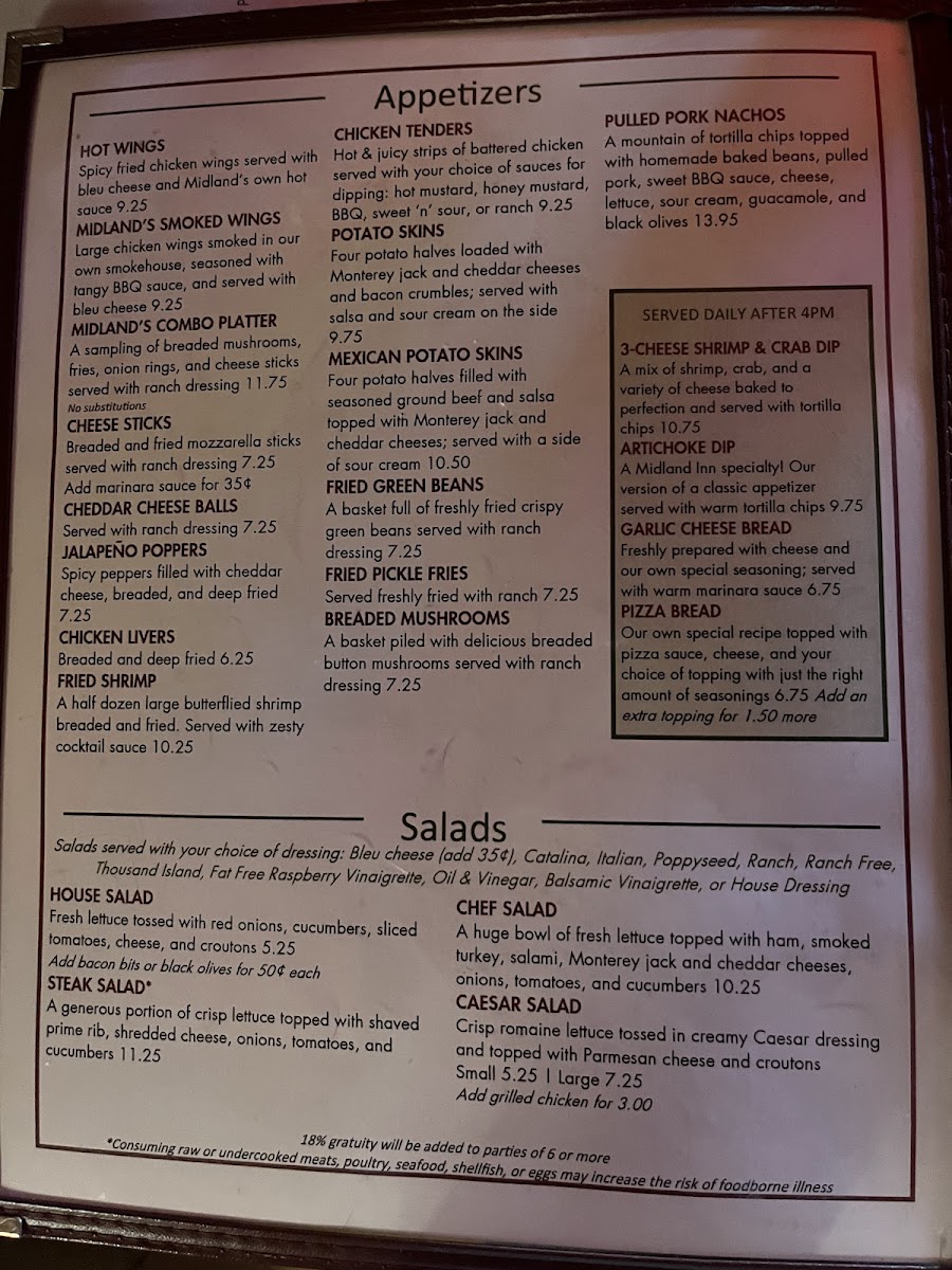 a midland inn specialty! our version of a classic appetizers served with warm tortilla chips. served daily after 4pm